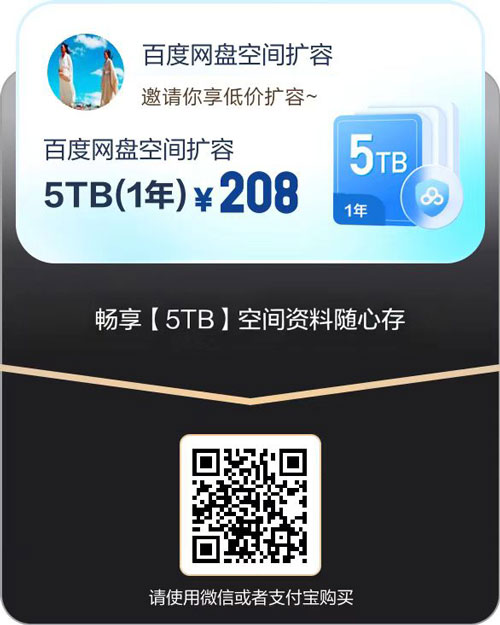 百度网盘空间扩容5TB一年208 活动入口:直达官方活动页