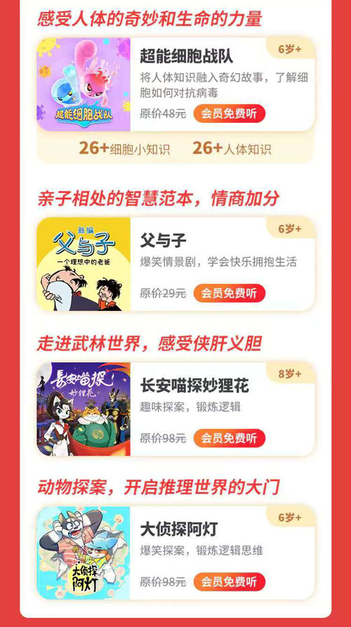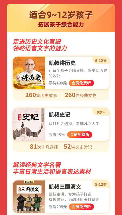 凯叔讲故事会员优惠里,两年卡力度最大,直降 + 赠时长,日均成本不到 5 毛钱,畅听 3 万 + 集内容,包括名著、国学、科普、睡前故事。