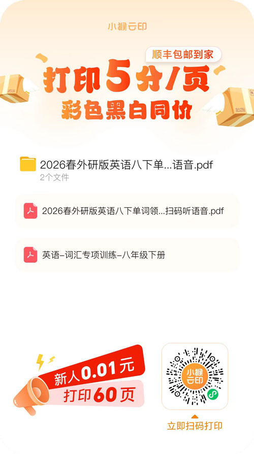 后来我发现了一个超省心的打印方式,打印仅需5分/页,黑白、彩印同价,不额外收费,满额就包邮,多地可实现次日达,不用等太久就能拿到打印好的资料。不管是2026春外研版英语八下单词领读资料、同步练习,还是自己整理的错题笔记、单词清单,都能一键上传打印,字迹清晰、纸张厚实,翻阅起来特别方便。