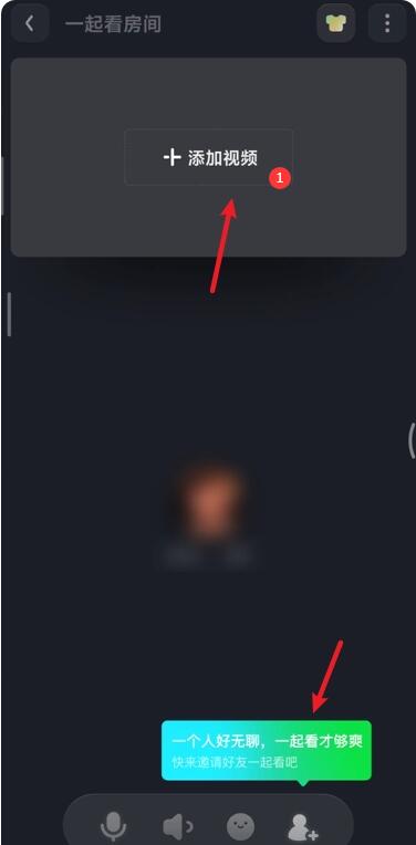 2、进入一起看页面,找到【立即创建】。进入房间页面后,选择【添加视频】,并在下方点击邀请好友图标,邀请好友进入房间。