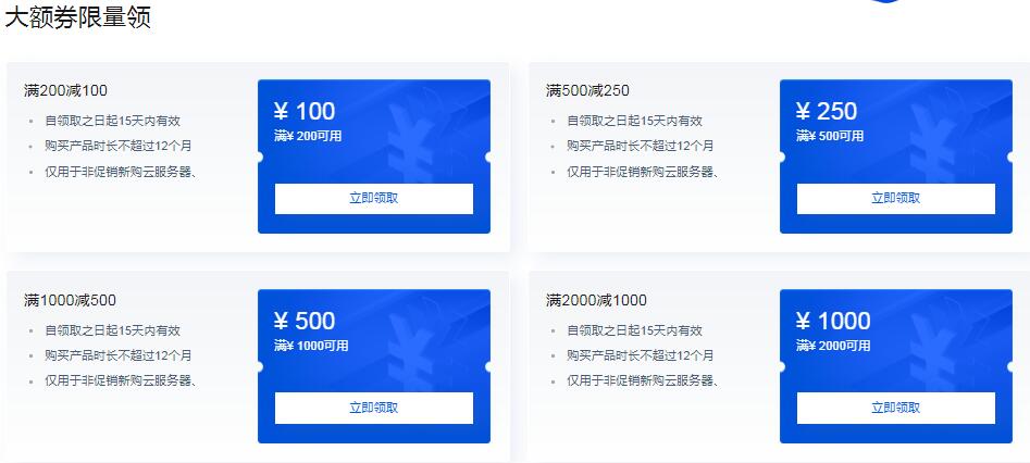 优惠券满减,满200减100, 满500减250, 满1000减500, 满2000减1000, 满1000减100, 满3000减160。
